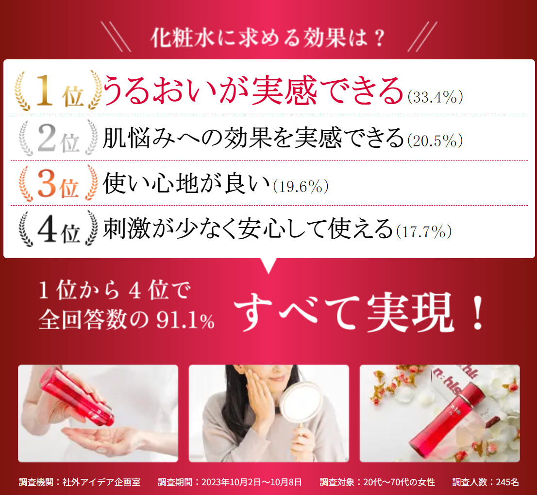 これらの成分が組み合わさることで、潤いのある肌へ導き、使い心地はさらりとしていてもしっとり感が持続します。また、香料は不使用で、肌への優しさを考えた設計です。
