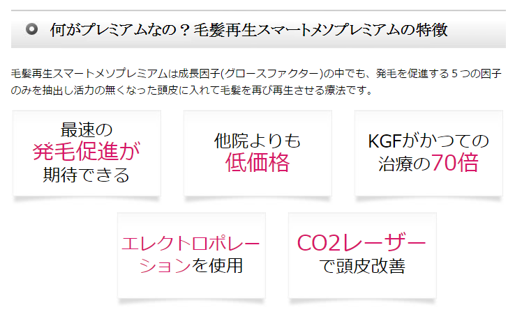しかしルネッサンスクリニックではHARG療法に変わる独自の発毛治療法、「毛髪再生スマートメソプレミアム」が受けられます。半年6回コースで38万8,000円と、ハーグ療法の約3分の1の値段で受けられる画期的な治療法です。